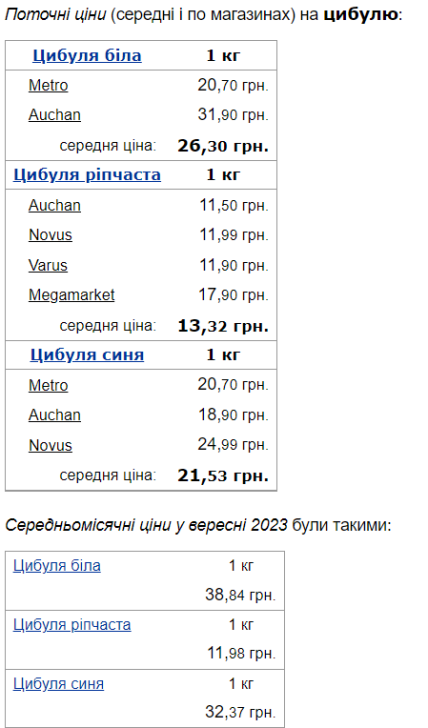 Лук белый стоил за 1 кг 38,84 грн, лук репчатый продавался за 1 кг 11,98 грн, а лук синий — за 1 кг 32,37 гривны.