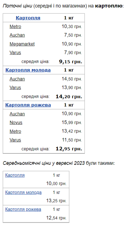 В прошлом месяце картофель был в цене 10,00 гривен за килограмм. Картофель розовый был дороже на 2,54 гривны — 12,54 гривны, а картофель розовый оказался самым дорогим — 13,25 гривны.