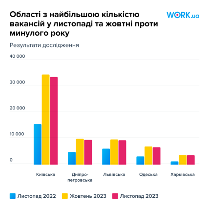 Если сравнить с довоенными показателями, наибольший прирост рабочих мест на западе страны: в Закарпатской (180%), Ивано-Франковской (167%), Хмельницкой (147%), Черновицкой (142%) и Львовской области (138%). Также в ноябре против прошлого месяца прирост вакансий фиксируем в прифронтовых областях: Черниговской (+3%, 1182 вакансии), Николаевской (+2%, 1263), Запорожской (+1%, 1869).