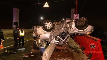 В ночь на 16 декабря на Новому мосту в Днепре произошло ДТП в котором погибла женщина. Легковушка Dacia при заезде на мост врезалась в отбойник и перевернулась.