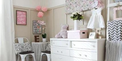 Не вся мебель для детской комнаты новая. Некоторые элементы прошли модернизацию, и обрели вторую жизнь. Так вещи ребенка хранятся в большом комоде, который достался от соседа и после покраски стал выглядеть по-современному. Декоративные милые вещицы украшают стену возле него. Это – нарядное платьице, картины, пушистые шары, подвешенные к потолку, большие буквы, обтянутые тканью или выполненные из дерева, оригинальные рамки. Даже лестнице здесь нашлось определенное место.