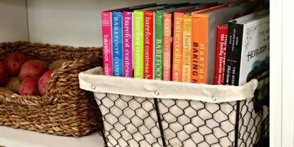 Дизайн интерьера кухни может быть выполнен в разном стиле. Современное обустройство и минимализм дает возможность проявить фантазию и самостоятельно создать место хранения для разных бытовых предметов. Особенно это актуально на маленькой кухне, где важно задействовать любое свободное пространство, но при этом соблюсти баланс и не перегрузить комнату мебелью. Железные корзины, закрепленные на стенном пространстве - отличная идея хранения кулинарных книг.