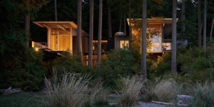Потрясающий лесной Домик в Лонгбранче (Cabin at Longbranch), Вашингтон, США, разработанный студией Olson Kundig Architects, имеет давнюю историю. Его строительство было начато в 1959 году Джимом Олсоном из Olson Kundig Architects, который в то время был студентом первого курса архитектурного института. На строительство домика в старом еловом лесу отец выделил Джиму Олсону 500 долларов. Впоследствии небольшое строение в виде сарайчика площадью всего 18,5 квадратных метров постоянно перестраивалось и расширялось в 1981, 1997, 2003 и 2014 годах. Процесс трансформации дома можно назвать «наслаиванием» — в прошлое органично и бережно вписывалось новое, образуя новый архитектурный ансамбль. В 1980-х годах дом состоял из трех маленьких павильонов, соединенных между собой деревянными платформами.