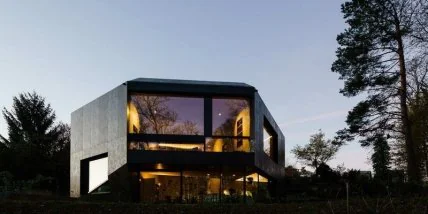 Этот необычный дом кристаллической формы построен для семьи из пяти человек на живописном участке недалеко от Базеля. Слегка скошенный на юг участок окружен с востока и юга зрелым лиственным лесом. Захватывающие виды в густую, глубокую листву летом и безлистая воздушная структура зимой стали решающим фактором при калибровке дневного света и организации пространства в доме, а взаимодействие с окружающей природой стало лейтмотивом для архитектора. Внутри дома выполнено тщательное зонирование между закрытыми спальными помещениями и открытыми общими зонами. Основные конструкции выполнены из монолитного бетона, наружная отделка — из ржавого металла (кортена). Главным материалом интерьера стал открытый бетон, который смягчают элементы из дерева.