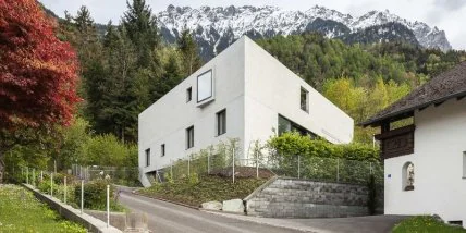 Эта монолитная треугольная структура расположена на наклонном участке у дороги между лесом и малоэтажной жилой застройкой. В доме три этажа, он имеет форму равностороннего треугольника. Внизу находится гараж и технические и подсобные помещения. На втором этаже расположена общая зона и три спальни, вверху есть ещё одна спальня и кабинет. Изюминкой проекта стали роскошные террасы на первом этаже и на крыше, при этом терраса внизу выполняет роль объединяющего элемента между внутренним пространством и окружающим ландшафтом, а терраса вверху максимально закрыта, зато имеет видовую площадку. Основные конструкции выполнены из монолитного бетона.