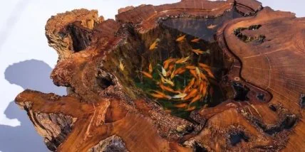 Вьетнамский художник Ти Эй (Ti Ay) создаёт восхитительные журнальные столики, создавая внутри них иллюзию пруда, заполненного яркими карпами кои. Без сомнения, самой впечатляющей его работой является стол в виде ствола дерева с водой и водоворотом из рыб. Несмотря на поразительную реалистичность на самом деле эти рыбки нарисованы. Секрет создания таких рыб состоит в слоях прозрачной смолы, между которыми художник рисует двухмерных рыб, которые впоследствии приобретают объём, становясь очень реалистичными. Художник заполняет реалистичными карпами кои не только столы, но и небольшие чаши.