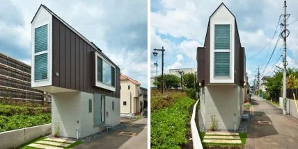 Спроектировали его архитекторы компании Mizuishi Architects Atelier. В их распоряжении был совсем небольшой кусочек земли размером в 55 кв.м, находящийся между рекой и дорогой. В результате дом получил такую узкую треугольную форму.