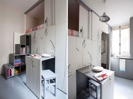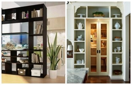 Для хранения вещей лучше использовать закрытые шкафы, а для размещения книг и различных аксессуаров – открытые серванты или сквозные модули. Такой вариант, как нельзя лучше, подойдет для создания перегородок или оформления пространства вокруг двери.
