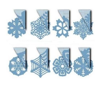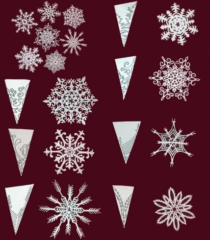 Предыдущий способ украсить дом снежинками к Новому году не единственный. Если вам не хочется заморачиваться и придумывать разные узоры, можно решить задачу не качеством, а количеством. Как сделать снежинки из бумаги? Схемы могут быть одинаковыми и достаточно простыми, а вот цвет бумаги выберите разный.