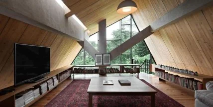 Построенный на холмах Бандунга в Индонезии частный дом EH Residence спроектировала студия Andramatin. Вилла выходного дня площадью 390 квадратных метров создана для матери и ее детей. Она представлена тремя спальнями и несколькими зонами для совместного отдыха и времяпрепровождения, связанными единым балконом. Резиденция закрыта от дороги и изолирована густыми соснами, но полностью открывается к нисходящему склону и виду на город в южной части участка. Прохладный климат региона уравновешен в проекте благодаря использованию различных видов древесины, что обеспечивает комфорт и ощущение тепла в резиденции для отдыха. Несколько уровней создано с учетом необходимой конфиденциальности. На первом этаже виллы спроектированы зоны обслуживания и две спальни, выходящие на юг. На втором уровне расположены гостиная, столовая, кухня, главная спальня и комната для чтения в мезонине. Эти зоны разделены камином и раздвижными стеклянными дверями, которые открываются ежедневно и ведут на длинный балкон. Световой люк в необычной по форме деревянной крыше приветствует солнце, наполняя пространство дополнительным теплом.
