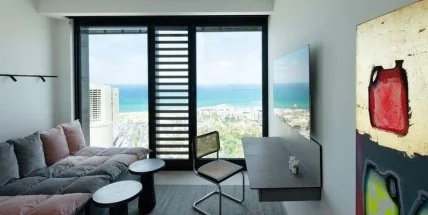 Квартира площадью 145 квадратных метров расположена на 22 этаже элитного жилого комплекса на берегу Средиземного моря и имеет потрясающие виды на морской пейзаж. Перед автором проекта стояла задача универсальной планировки пространства – все помещения должны быть ориентированы в сторону моря. Чтобы усилить ощущение простора и открытости, гостиная, столовая и кухня были объединены в одно центральное пространство с максимальным панорамным видом на море. Это общественное пространство определяется четырьмя внутренними фасадами, каждый из которых имеет разные материальные характеристики. Справа от входа, параллельно стеклянному фасаду, размещается кухня Bulthaup. Кухонный фасад покрыт анодированным алюминием, чей уникальный зеленоватый оттенок меняется в зависимости от естественного света, который отражается на его поверхности и преображает по мере движения солнца. В зоне столовой стоит квадратный обеденный стол на 8 персон из бразильского изумрудно-зеленого камня. Открытую бетонную стену позади стола украшают светильники американского дизайнера LEE BROOM и картина израильского художника Авива Гринберга (Aviv Grinberg), демонстрирующая резкую цветовую палитру. Из столовой предусмотрен выход на террасу площадью 20 квадратных метров, прекрасно оборудованную для отдыха. Специально спроектированные террасные кровати расположены напротив друг друга, настраивая на приятное времяпровождение. Изящный текстиль привносит ощущение тепла и уюта. Скрытая дверь в бетонной стене из столовой ведет в спальню, оформление которой впечатляет креативностью. У окна с захватывающими видами на море и побережье установлена отдельно стоящая ванная, часть главной ванной комнаты. Удобное кресло, стильные низкие столики и большое зеркало создают богемную атмосферу. По другую сторону спальни расположена главная ванная комната с душевой кабиной, парной и сауной. Ее стены от пола до потолка покрыты чистым белым мрамором Statuario с серыми прожилками. Обработка камня и установка с использованием метода BOOK MATCH создают монолитное пространство ванной комнаты. Каменная скамья в душевой кабине, встроенная поверхность раковины и ручка для душа выполнены из того же мрамора, что создает ощущение хаммама. С другой стороны гостиной за тонкой железной стеной располагается гостевая комната c ванной комнатой. Ощущение непрерывности и плавности во всем интерьере, богатство материалов и текстур, смелые дизайнерские комбинации делают апартаменты яркими и выразительными.