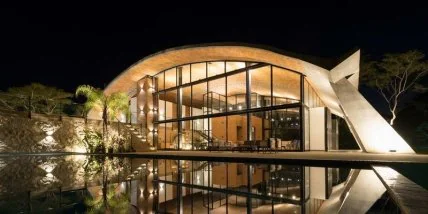 Основная конструкция этого необычного дома представляет собой большепролетную изогнутую крышу без промежуточных опор, которая формирует огромное внутреннее пространство открытой планировки. Крыша поддерживается шестью наклонными бетонными опорами (по три с каждой стороны), которые кроме основного назначения также работают как желоба для сбора дождевой воды, доставляя ее в цистерну, где она используется для орошения земли. Для опалубки использовались колониальные кирпичи, которые обеспечивают текстуру, улучшают акустику и способствуют дополни тельной теплоизоляции. Что касается ориентации, то дом расположен так, чтобы защитить самые неблагоприятные фасады с востока и запада. Таким образом, дом защищен от солнца днем, особенно летом, что помогает поддерживать комфортную температуру внутри. Большие окна открываются полностью, также в верхней части крыши есть небольшое отверстие, которое работает как дымоход, обеспечивая лучшую вентиляцию.
