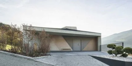 Пентагональная форма этого необычного дома в итальянских Альпах выходит наружу из структурного ядра лестничного колодца, обеспечивая потрясающий вид на ландшафт. Без передней или задней части дом демонстрирует вращающийся континуум жилых помещений, которые сопровождаются разнообразными видами. От долины Изарко до близлежащих лугов, до лесов и через сплоченный поселок небольшого городка на склоне холма южно-тирольский пейзаж присутствует всегда. Окна от пола до потолка позволяют смене цветов и фактур сезонов стать частью повседневной жизни семьи. Владельцы заявили, что они искали дом, в котором они "могли бы дышать": он должен был быть просторным, но не слишком большим, и он должен был быть открытым без ущерба для конфиденциальности каждого члена семьи. Короче говоря, дом должен был дать ощущение свободы. Воспользовавшись наклонными площадками, консоль на уровне первого этажа наружу создает впечатляющее жизненное пространство - пространство воздушного комфорта и благополучия. Непрерывность теплых серых полов контрастирует с натянутой вибрацией деревянного кедрового потолка. Деревянный навес из кедра местного производства воспроизводит геометрию дома и объединяет деревянную отделку с механической и осветительной инфраструктурой, образуя единую систему. С тремя детьми в возрасте от 12 до 18 лет семья также интересовалась домом, который был отражением их самих. Это созвучие между архитектурой дома и тем, что оно сообщало о семье, стало важной дискуссией при разработке дизайна дома. Близость к природе, уважение к окружающей среде и связь с местным сообществом - все это аспекты, которые должны быть учтены в проекте. Экологически чистые материалы вместе с тщательной оценкой энергоэффективности ограждающих конструкций позволили дому получить сертификат "Klimahaus A". Большой выступ крыши на уровне улицы создал общественный социальный барьер для дома: соседи останавливаются, чтобы поприветствовать хозяев и поболтать под крышей, которая образует эту новую наружную комнату. Будучи профессиональным плотником и владельцем магазина розничной торговли дизайнерской мебели, заказчика акцентировал внимание к столярной части и деталям, выступающим в качестве каркаса, в котором мебель могла бы выдержать себя. При входе в дом на уровне земли основой жилой зоны стала открытая планировка, объединенная в ряд микро-условий: прихожая, небольшой кабинет, гостиная, кухня, столовая и вторая гостиная с камином. Главная спальня и ванная комната, а также гостевая ванная комната также расположены на этом уровне. Центральная деревянная лестница вложена в открытые бетонные стены служебного ядра и ведет к центральному фойе, которое дает доступ к трем спальням, большой ванной комнате, прачечной и многофункциональной комнате. Въезд из гаража происходит на этом уровне.