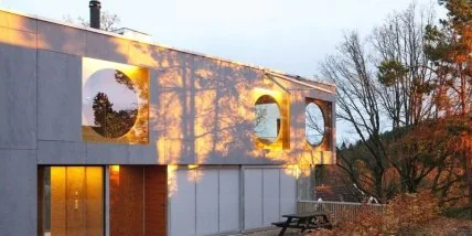 Участок, который ранее считался непригодным для строительства и пустовавший в течение 20 лет, был замечен новыми владельцами благодаря панорамным видам на фьорд с востока и запада. Учитывая влажный и ветреный климат в регионе, архитекторы уделили особое внимание внешней поверхности дома. Нижняя часть резиденции выполнена из монолитного бетона, а в верхней части использовали сборную массивную деревянную конструкцию с фиброцементной облицовкой и внутренней отделкой из осины. Между ними возникла пустота, в которой спроектировали вход и гараж, одновременно служащий крытой летней гостиной на открытом воздухе.
