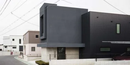Участок имеет форму узкой и вытянутой полосы. Задачей архитекторов было построить дом, который обладал бы достойным дизайном и уютом в таком загроможденном городском пейзаже. Экстерьер состоит из объёмов с тщательно продуманной пропорцией, расположением окон и материалов. Высокое окно и выступающее крыльцо подчеркивают вертикальные и горизонтальные линии, делая фасад не слишком однородным. Входы расположены с обеих сторон крыльца, чтобы повысить удобство доступа с парковочных мест, которые расположены с обеих сторон. Это умеренно блокирует взгляды от дороги и обеспечивает конфиденциальность. Внутренняя часть первого этажа соединена с входами вдоль глубокого и полосообразного участка. Фальшпол, лестница и мебель ритмично расположены вдоль прохода. Они используются в качестве гибких пространств для общения, чтобы обогатить повседневную жизнь.
