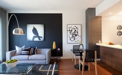 Если вы не хотите обозначать разными цветами все помещение, оформите обычную акцентную стену в одной из зон. Наиболее актуальным это решение станет для разделения спальни и кухни. Впрочем, такой способ можно использовать и для зонирования гостиной и спального места.