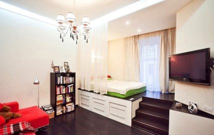 Если перенести какую-нибудь зону на подиум, она автоматически станет отдельным пространством. Но если вы хотите усилить визуальный эффект, можно дополнить данный способ зонирования перегородкой, шторами либо цветом. Последний вариант подойдет в том случае, если комната у вас оформлена в едином цвете, например, белом, а подиум, с оборудованной на нем зоной, вы сделаете в других тонах.
