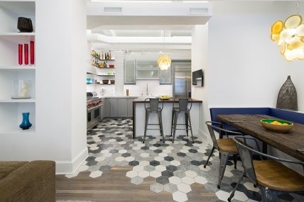 Такое решение дизайнеры часто используют в квартирах-студиях. В этом случае в зоне кухни используют более устойчивое покрытие, например, легкую в уходе плитку, а в спальной зоне применяют ламинат, линолеум или материалы, имитирующие дерево.