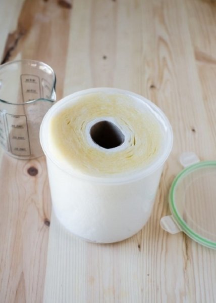 В миске смешайте два стакана воды, две столовые ложки любого косметического масла и несколько капель чайного дерева. Поставьте смесь в микроволновку на 10-15 секунд, чтобы она нагрелась и получилась однородная консистенция. Далее разрежьте рулон с бумажными полотенцами пополам, положите одну половину в миску, залейте полученным раствором и дайте пропитаться. После этого удалите картонную втулку и используйте самодельные салфетки каждый день перед сном.