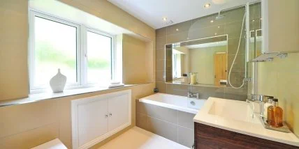 Хороший интерьер ванной комнаты оформлен в сдержанных тонах.