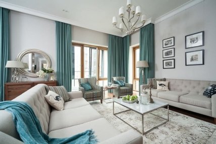 Одним из самых главных правил гармоничного интерьера является создание пересечений. Например, цвет ковра может совпадать с цветом штор или диванных подушек. Кстати, вы можете подобрать как одинаковые оттенки для текстиля, так и близкую цветовую гамму.