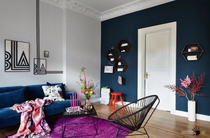 Совсем не обязательно украшать стены декоративными элементами. Фотографии, картины и аксессуары уместно смотрятся далеко не в каждом интерьере, особенно, если переборщить. Для оформления поверхностей можно использовать другой дизайнерский прием под названием «акцентная стена». Просто покрасьте одну из стен контрастным цветом, который вам очень нравится и сочетается с общим интерьером комнаты. Например, если в помещение преобладает синяя мебель, то в таком же оттенке можно сделать одну из стен, при условии, что остальные поверхности имеют нейтральную цветовую гамму.