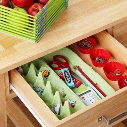 Храните мелкие канцелярские принадлежности в картонном лотке для яиц и в бумажных формочках для кексов. Такая система хранения позволит навести порядок в шкафчике и избавиться от множества коробочек, в которых приходиться хранить мелочи, чтобы они не терялись.