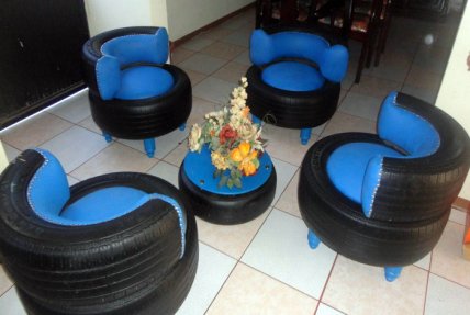 Чудесный мебельный гарнитур, который состоит из четырех кресел и кофейного столика, сделанного из ненужных автомобильных покрышек.