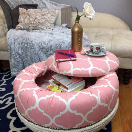 Очаровательный журнальный столик с местом для хранения различных мелочей, сделанный из автомобильной покрышки с мягкой тканевой отделкой и крышкой из фанеры, обтянутой такой же тканью, прекрасно впишется в интерьер женской гостиной.