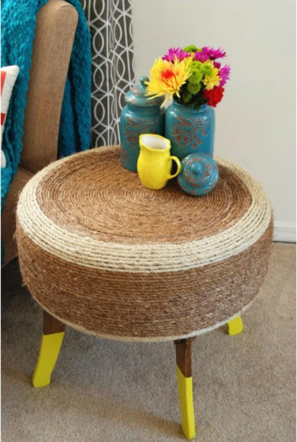 Из небольшой покрышки, пары кругов фанеры и деревянных ножек можно смастерить чудесную тумбу. А чтобы изделие приобрело эстетичный вид, плотно обмотайте покрышку грубой веревкой и покрасьте ножки в яркий цвет.