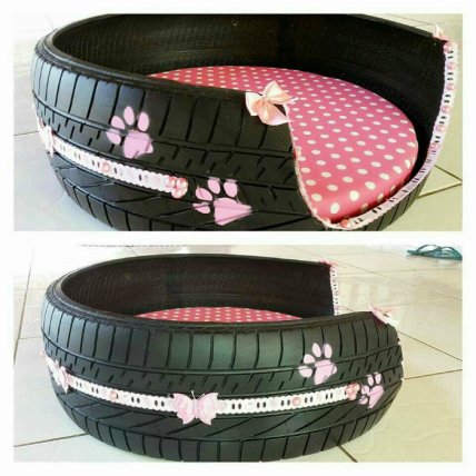 Тщательно вымытая и аккуратно обрезанная автомобильная покрышка любого диаметра станет отличной основой для создания комфортной лежанки для кошки или небольшой собачки. Дополните изделие самодельным матрасом из круга фанеры, поролона и чехла из яркой ткани.