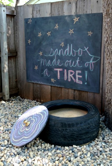 Автомобильную покрышку большого диаметра можно использовать для создания мини-песочницы для детей. Для этого нужно просто прикрепить к шине фанерное дно и засыпать песок. Также для удобства песочницу можно оборудовать деревянной крышкой, которая защитит ее содержимое от ветра и дождя.
