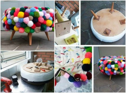 Невысокий табурет с яркими помпонами, который можно сделать из одной единственной покрышки, двух кругов фанеры и самых обычных деревянных ножек, станет креативной деталью любого интерьера.