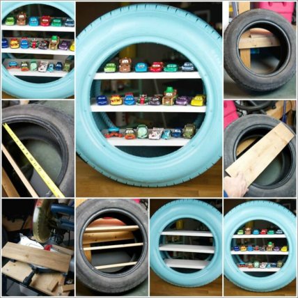 Небольшой настенный стеллаж, который легко можно сделать из, покрашенной в яркий цвет, ненужной шины и нескольких деревянных полок, прекрасно впишется в интерьер детской и подойдет для хранения небольших игрушек.