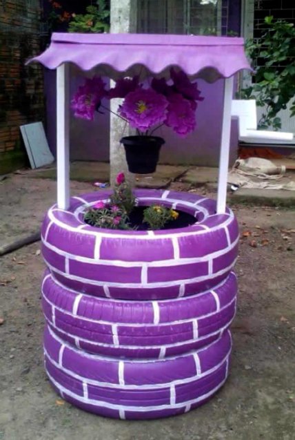 Износившиеся старые покрышки можно использовать для создания чудесной садовой композиции в виде колодца. Для этого покрасьте шины в любой яркий цвет, к одной из покрышек прикрепите круг фанеры. Сложите шины друг на дружку так, чтобы последней оказалась та, что с фанерным дном. Из деревянных досок сделайте каркас для крыши из шифера или профнастила. Во внутрь колодца поставьте горшки с цветами, а также подвесьте один из горшочков на центральную балку крыши.