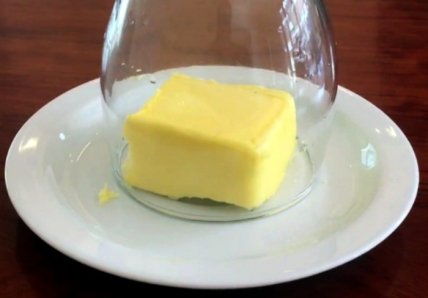 Есть маленькая хитрость, которая позволит быстро растопить охлажденное или замороженное масло. Просто положите кусок масла под нагретый стакан. Уже через несколько минут верхний слой станет мягким и его без труда удастся намазать на хлеб.