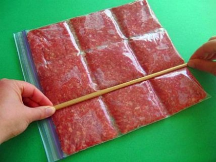 Никогда не замораживайте фарш комком. Лучше раскатайте его в пакете до состояния тонкого блинчика и в таком виде положите в морозилку. Фарш в такой упаковке не займет много места, а когда придет время готовки, разморозится быстрее, чем за полчаса.