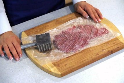 Отбивайте мясо, аккуратно запаковав его в полиэтиленовый пакет. Таким образом вы защитите стены и близлежащие поверхности от брызг и мясных волокон.