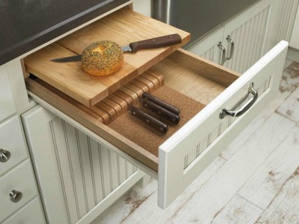 Любой выдвижной шкафчик может стать дополнительной рабочей поверхностью на кухне. Для этого его нужно только выдвинуть и положить сверху разделочную доску. Такая хитрость здорово выручить, когда нужно что-то быстро нарезать или поставить одну из кастрюль.