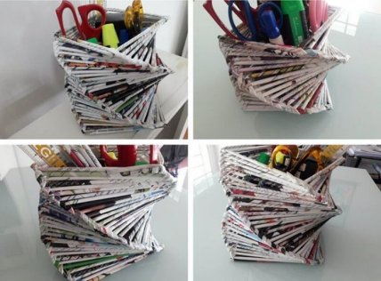 Оригинальный органайзер для канцелярских принадлежностей, сплетенный из журнальных страниц, скрученных в тонкие трубочки.