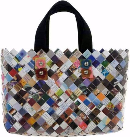 Дамская сумка, которую может сплести каждый из плотных глянцевых страниц, сложенных в длинные полоски.