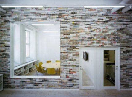 Журнальные страницы можно использовать в качестве полноценного отделочного материала стен. Правда процесс отделки достаточно кропотлив и займет много времени. Для реализации данной идеи, страницы нужно скрутить в плотные трубочки и по очереди клеить на стену. Результатом работы станет акцентная стена с уникальной фактурой и рисунком.