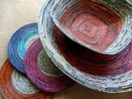 Страницы журналов, скрученные в тонкие трубочки, можно использовать для создания необычных тарелок и подставок под горячее. Единственным недостатком таких поделок является то, что бумага плохо переносить влагу. Поэтому для того, чтобы изделия прослужили дольше, покройте их толстым слоем клея или другого защитного покрытия.