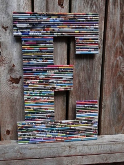 Из журнальных страниц можно сделать большие объемные буквы, которые сейчас широко используются для декора. Для этого странички нужно свернуть в тонкие трубочки, зафиксировать клеем и приклеить на букву, вырезанную заранее из плотного картона.