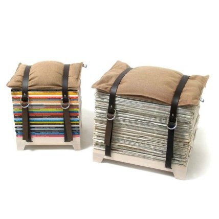 Невысокие табуретки, для создания которых потребовались лишь стопки журналов, старые ремни и мягкие подушечки.