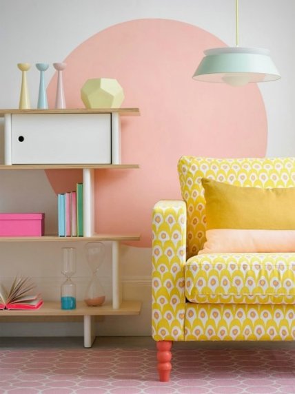 Мягкий диванчик, перетянутый забавной желтой тканью с простым принтом внесет в гостиную нотки света и тепла.