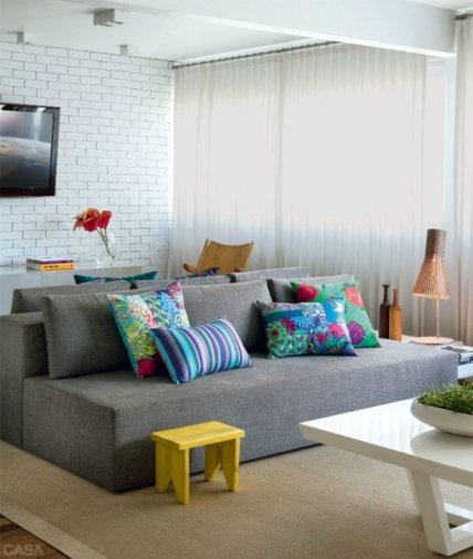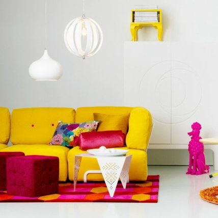 Поролоновый диван насыщенного желтого цвета прекрасно впишется в светлую комнату с яркими аксессуарами цвета фуксии.