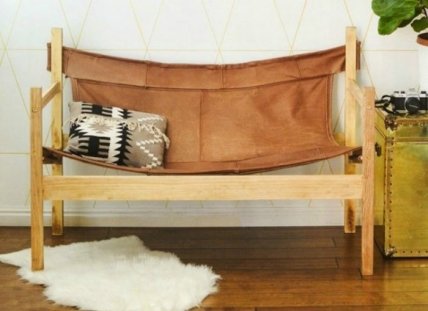 Необычный кожаный диван-гамак на деревянном каркасе — прекрасная идея для переделки старого изношенного дивана.