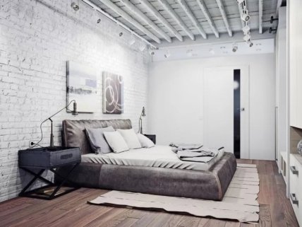 Сейчас в моде сдержанность и минимализм. Стиль лофт как нельзя лучше соответствует этим требованиям. Интерьер спальни в этом стиле - это максимальное количество свободного места, большие оконные проемы, оригинальные элементы декора, контраст фактур и холодных оттенков. Стены покрываются грубой штукатуркой или оформляются кирпичной кладкой. Потолки окрашиваются в белый цвет и декорируются серыми досками.
