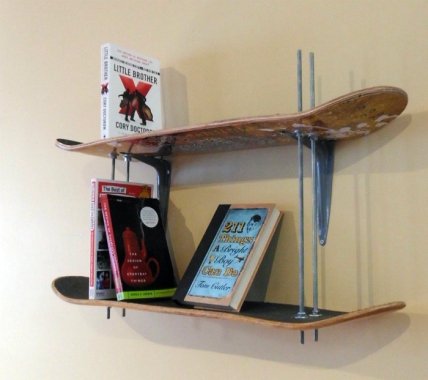 Стильные и практичные полки, сделанные из двух скейтбордов, гармонично впишутся в интерьер современной спальни или комнаты подростка.